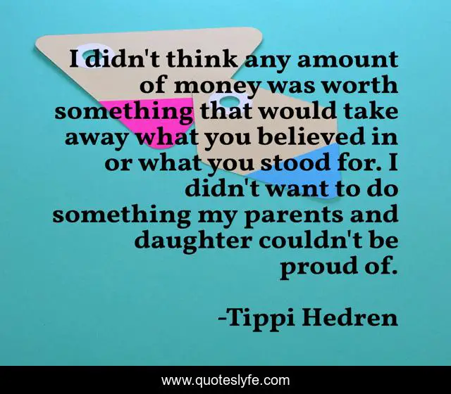 This page presents the quote "I didn't think any amount of money was worth something that would take away what you believed in or what you stood for. I didn't want to do something my parents and daughter couldn't be proud of.". Author of this quote is Tippi Hedren. This quote is about daughter, proud, parents,.