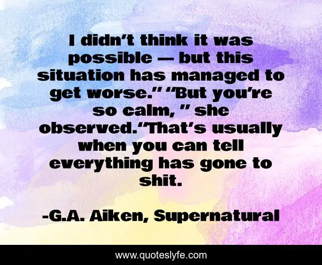 This page presents the quote "I didn’t think it was possible — but this situation has managed to get worse.” “But you’re so calm, ” she observed.“That’s usually when you can tell everything has gone to shit.". Author of this quote is G.A. Aiken, Supernatural. This quote is about problem, bad-situation, humor, calm,.
