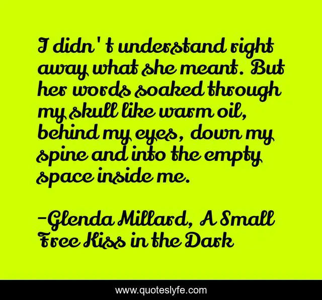 This page presents the quote "I didn't understand right away what she meant. But her words soaked through my skull like warm oil, behind my eyes, down my spine and into the empty space inside me.". Author of this quote is Glenda Millard, A Small Free Kiss in the Dark. This quote is about warm-oil, understand, empty-space, words,.