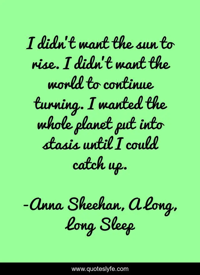 This page presents the quote "I didn't want the sun to rise. I didn't want the world to continue turning. I wanted the whole planet put into stasis until I could catch up.". Author of this quote is Anna Sheehan, A Long, Long Sleep. This quote is about world, stasis, truth,.