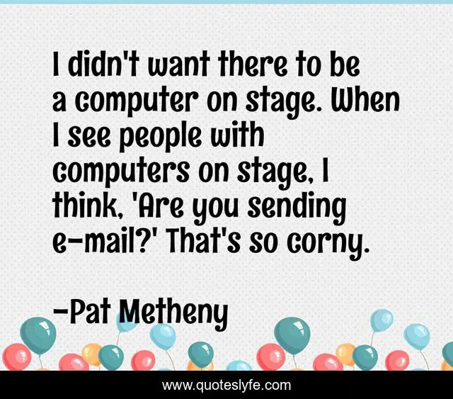 This page presents the quote "I didn't want there to be a computer on stage. When I see people with computers on stage, I think, 'Are you sending e-mail?' That's so corny.". Author of this quote is Pat Metheny. This quote is about think, people,.