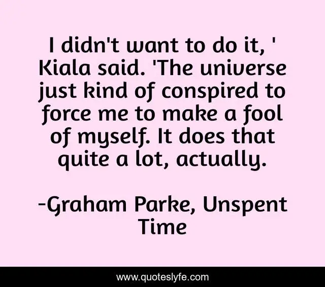 This page presents the quote "I didn't want to do it, ' Kiala said. 'The universe just kind of conspired to force me to make a fool of myself. It does that quite a lot, actually.". Author of this quote is Graham Parke, Unspent Time. This quote is about weird, philosophy, humor,.