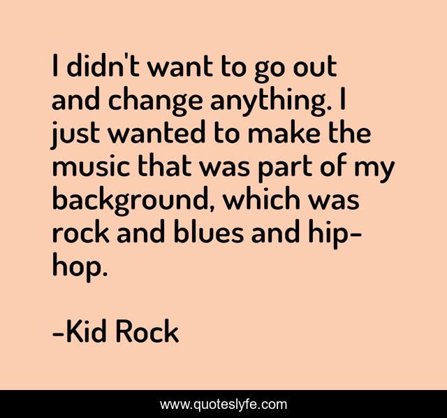 This page presents the quote "I didn't want to go out and change anything. I just wanted to make the music that was part of my background, which was rock and blues and hip-hop.". Author of this quote is Kid Rock. This quote is about blues, change,.