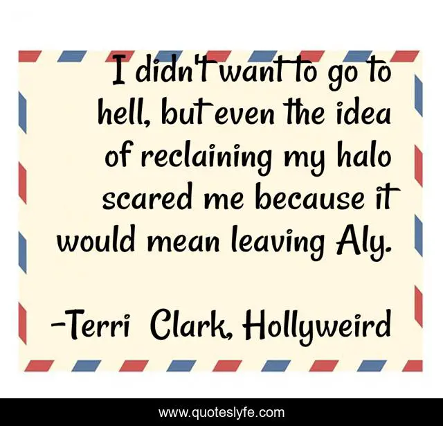 This page presents the quote "I didn't want to go to hell, but even the idea of reclaining my halo scared me because it would mean leaving Aly.". Author of this quote is Terri Clark, Hollyweird. This quote is about teen, humor, ya, angels, paranormal, demons, terri-clark, romance, hollyweird,.