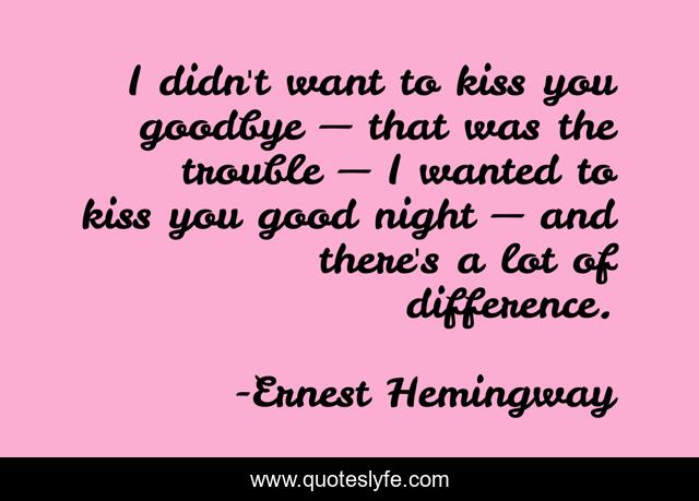 This page presents the quote "I didn't want to kiss you goodbye — that was the trouble — I wanted to kiss you good night — and there's a lot of difference.". Author of this quote is Ernest Hemingway. This quote is about trouble, ernest-hemingway, love, kiss, affection,.