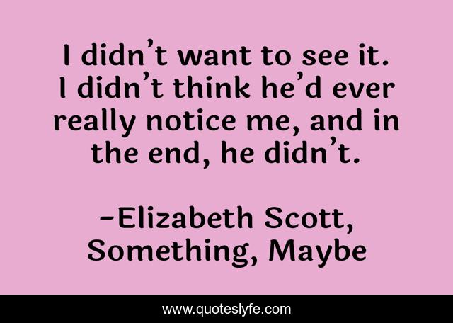 This page presents the quote "I didn’t want to see it. I didn’t think he’d ever really notice me, and in the end, he didn’t.". Author of this quote is Elizabeth Scott, Something, Maybe. This quote is about romance, young-adult, young-adult-romance, teenagers,.