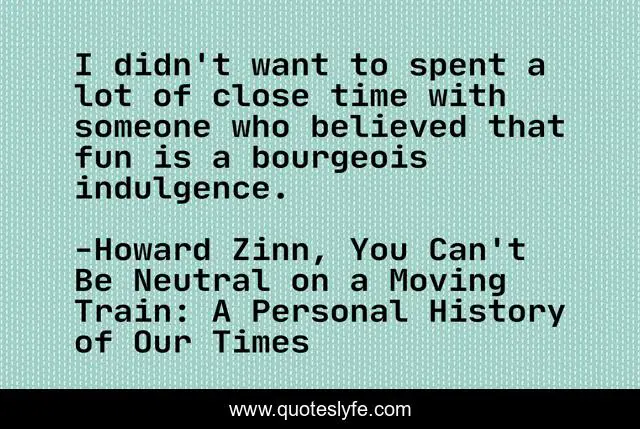 This page presents the quote "I didn't want to spent a lot of close time with someone who believed that fun is a bourgeois indulgence.". Author of this quote is Howard Zinn, You Can't Be Neutral on a Moving Train: A Personal History of Our Times. This quote is about fun, bourgeois-indulgence, priests,.