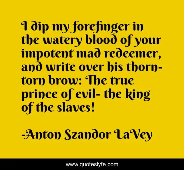 This page presents the quote "I dip my forefinger in the watery blood of your impotent mad redeemer, and write over his thorn-torn brow: The true prince of evil- the king of the slaves!". Author of this quote is Anton Szandor LaVey. This quote is about antichristian, atheism, blasphemy, satanism, jesus,.
