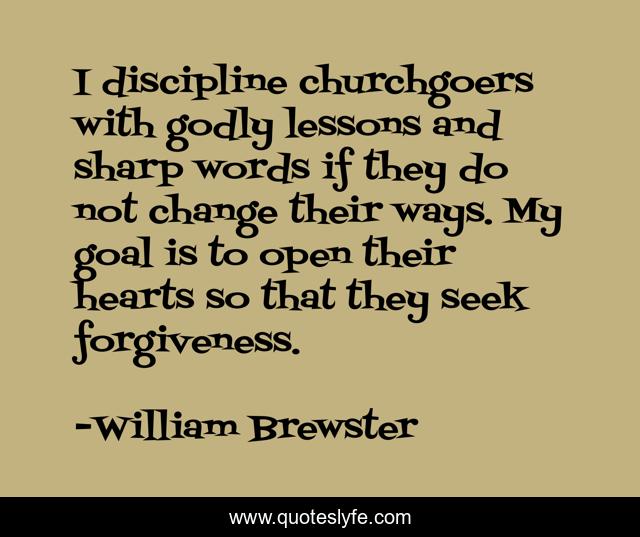 This page presents the quote "I discipline churchgoers with godly lessons and sharp words if they do not change their ways. My goal is to open their hearts so that they seek forgiveness.". Author of this quote is William Brewster. This quote is about change, goal, words,.