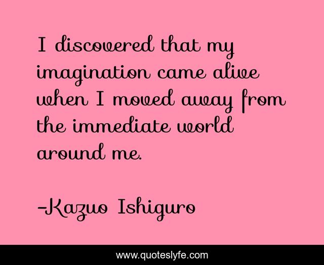 This page presents the quote "I discovered that my imagination came alive when I moved away from the immediate world around me.". Author of this quote is Kazuo Ishiguro. This quote is about me, world, alive,.