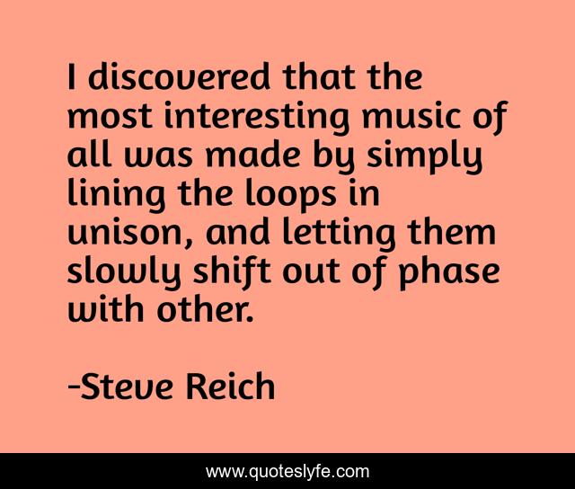 This page presents the quote "I discovered that the most interesting music of all was made by simply lining the loops in unison, and letting them slowly shift out of phase with other.". Author of this quote is Steve Reich. This quote is about interesting, made, slowly,.