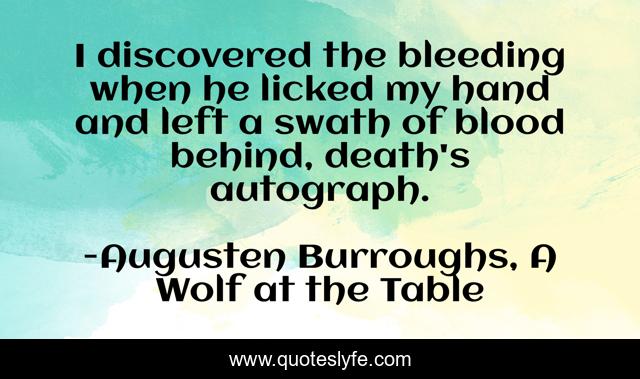 This page presents the quote "I discovered the bleeding when he licked my hand and left a swath of blood behind, death's autograph.". Author of this quote is Augusten Burroughs, A Wolf at the Table. .