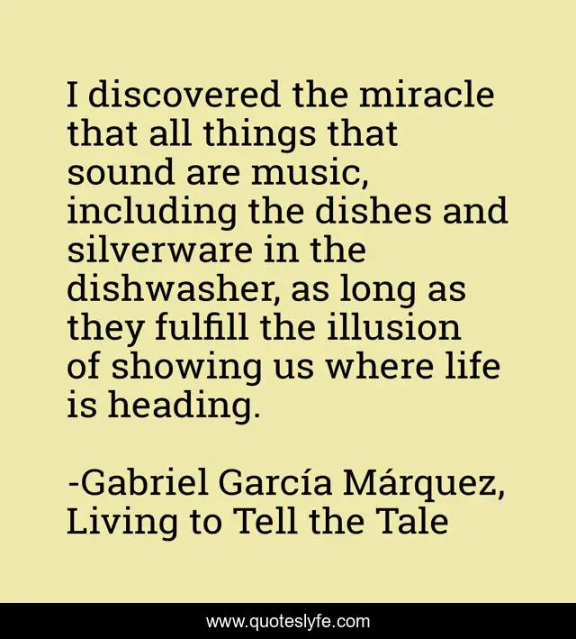 This page presents the quote "I discovered the miracle that all things that sound are music, including the dishes and silverware in the dishwasher, as long as they fulfill the illusion of showing us where life is heading.". Author of this quote is Gabriel García Márquez, Living to Tell the Tale. .