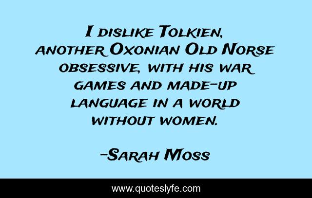 This page presents the quote "I dislike Tolkien, another Oxonian Old Norse obsessive, with his war games and made-up language in a world without women.". Author of this quote is Sarah Moss. This quote is about norse, feminism,.
