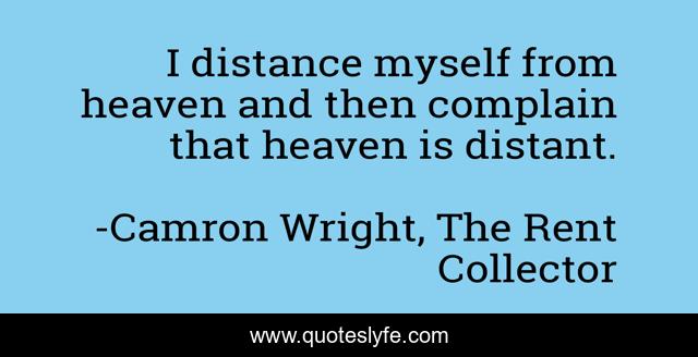 This page presents the quote "I distance myself from heaven and then complain that heaven is distant.". Author of this quote is Camron Wright, The Rent Collector. This quote is about distance, heaven,.