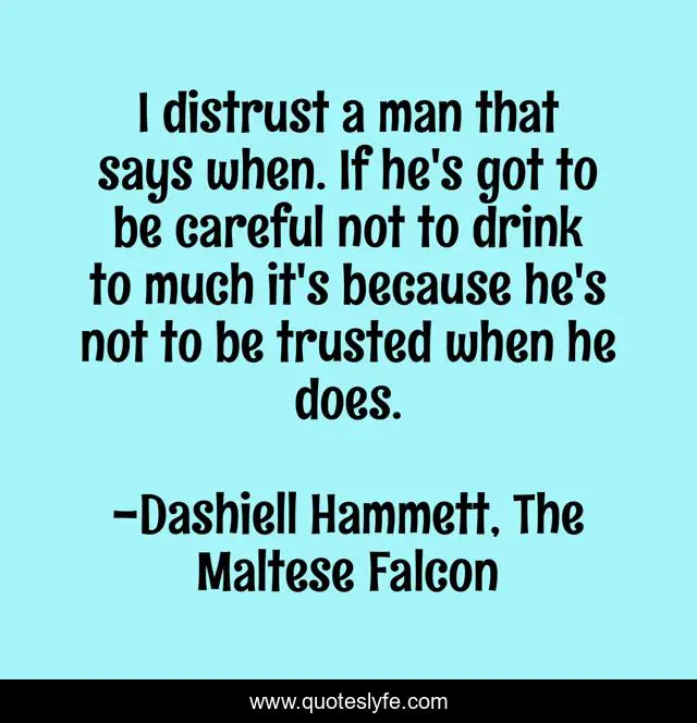 This page presents the quote "I distrust a man that says when. If he's got to be careful not to drink to much it's because he's not to be trusted when he does.". Author of this quote is Dashiell Hammett, The Maltese Falcon. .
