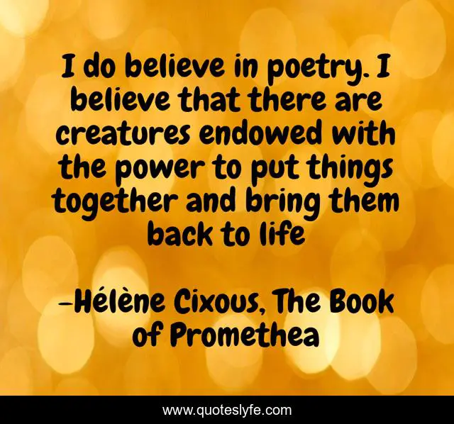 This page presents the quote "I do believe in poetry. I believe that there are creatures endowed with the power to put things together and bring them back to life". Author of this quote is Hélène Cixous, The Book of Promethea. This quote is about awaken, poetry,.
