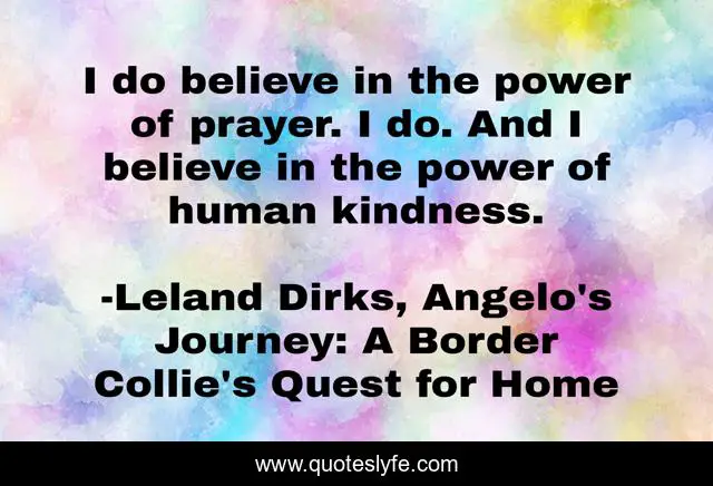 This page presents the quote "I do believe in the power of prayer. I do. And I believe in the power of human kindness.". Author of this quote is Leland Dirks, Angelo's Journey: A Border Collie's Quest for Home. This quote is about believe, kindness, humanity, prayer,.