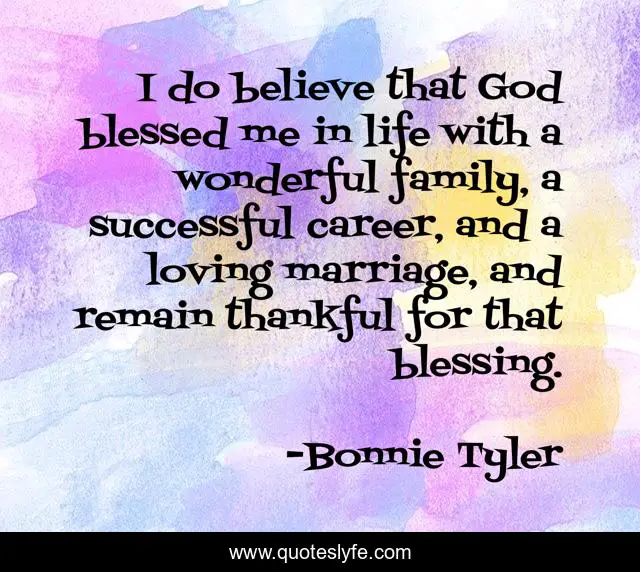 This page presents the quote "I do believe that God blessed me in life with a wonderful family, a successful career, and a loving marriage, and remain thankful for that blessing.". Author of this quote is Bonnie Tyler. This quote is about thankful, life, marriage,.