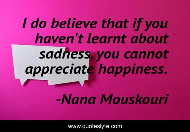 This page presents the quote "I do believe that if you haven't learnt about sadness, you cannot appreciate happiness.". Author of this quote is Nana Mouskouri. This quote is about sadness, believe, sad,.