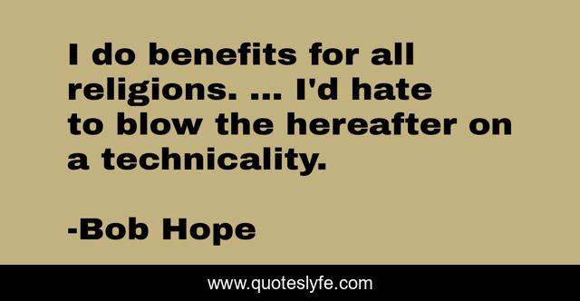 This page presents the quote "I do benefits for all religions. ... I'd hate to blow the hereafter on a technicality.". Author of this quote is Bob Hope. .