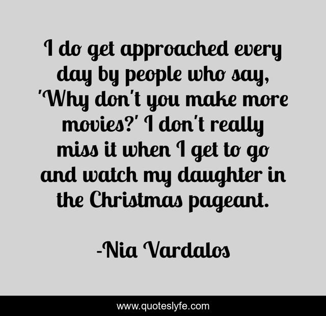 This page presents the quote "I do get approached every day by people who say, 'Why don't you make more movies?' I don't really miss it when I get to go and watch my daughter in the Christmas pageant.". Author of this quote is Nia Vardalos. This quote is about daughter, day, people,.