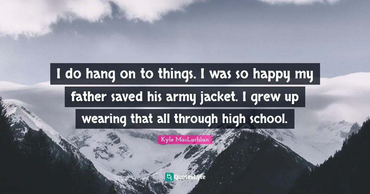 This page presents the quote "I do hang on to things. I was so happy my father saved his army jacket. I grew up wearing that all through high school.". Author of this quote is Kyle MacLachlan. This quote is about high school, school, father, army, saved, grew up, happy,.