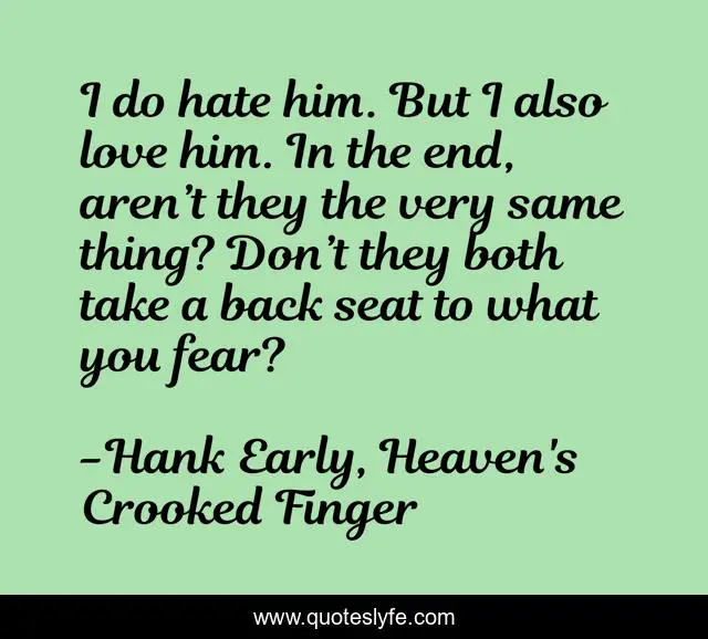 This page presents the quote "I do hate him. But I also love him. In the end, aren’t they the very same thing? Don’t they both take a back seat to what you fear?". Author of this quote is Hank Early, Heaven's Crooked Finger. This quote is about hate, fear, love, affection,.