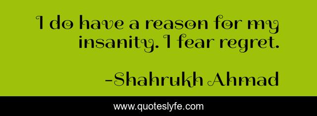 This page presents the quote "I do have a reason for my insanity. I fear regret.". Author of this quote is Shahrukh Ahmad. This quote is about confidence, regret, positive, motivational, insanity, optimistic,.