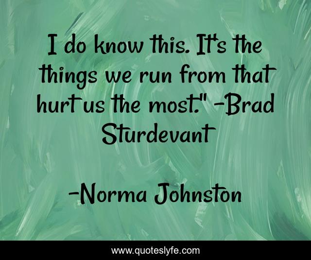 This page presents the quote "I do know this. It's the things we run from that hurt us the most." –Brad Sturdevant". Author of this quote is Norma Johnston. This quote is about running-away, ready-or-not, norma-johnston, brad-sturdevant, hurt,.
