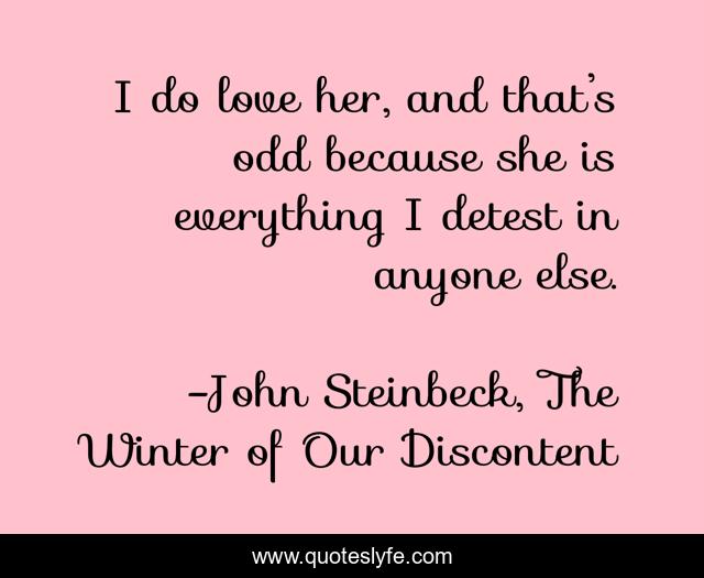 This page presents the quote "I do love her, and that’s odd because she is everything I detest in anyone else.". Author of this quote is John Steinbeck, The Winter of Our Discontent. This quote is about love, odd, the-winter-of-our-discontent, john-steinbeck, hate, affection,.