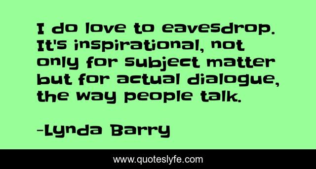 This page presents the quote "I do love to eavesdrop. It's inspirational, not only for subject matter but for actual dialogue, the way people talk.". Author of this quote is Lynda Barry. This quote is about dialogue, love, affection, people,.