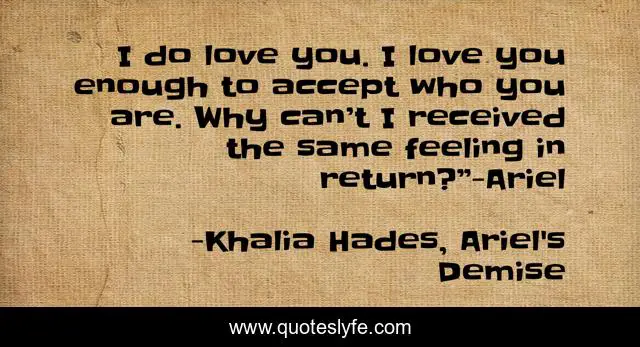 This page presents the quote "I do love you. I love you enough to accept who you are. Why can’t I received the same feeling in return?”-Ariel". Author of this quote is Khalia Hades, Ariel's Demise. This quote is about triton, ursula, curse, ariel, fiction, mermaids, fantasy, adult, the-little-mermaid,.