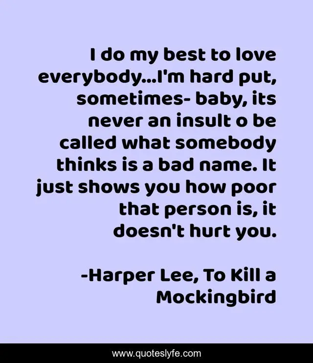 This page presents the quote "I do my best to love everybody...I'm hard put, sometimes- baby, its never an insult o be called what somebody thinks is a bad name. It just shows you how poor that person is, it doesn't hurt you.". Author of this quote is Harper Lee, To Kill a Mockingbird. .