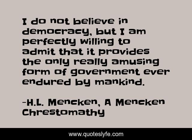 This page presents the quote "I do not believe in democracy, but I am perfectly willing to admit that it provides the only really amusing form of government ever endured by mankind.". Author of this quote is H.L. Mencken, A Mencken Chrestomathy. This quote is about humor, democracy, government,.