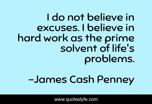This page presents the quote "I do not believe in excuses. I believe in hard work as the prime solvent of life's problems.". Author of this quote is James Cash Penney. This quote is about life, believe, hard work,.