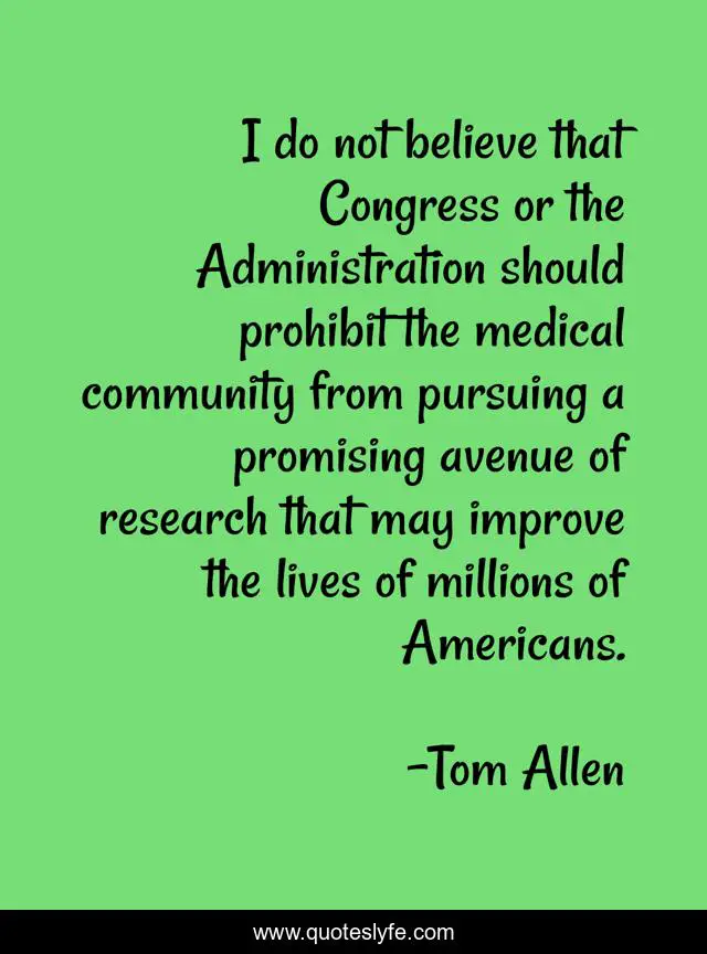 This page presents the quote "I do not believe that Congress or the Administration should prohibit the medical community from pursuing a promising avenue of research that may improve the lives of millions of Americans.". Author of this quote is Tom Allen. This quote is about believe, community, research,.