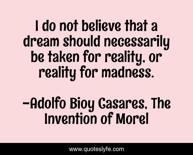 This page presents the quote "I do not believe that a dream should necessarily be taken for reality, or reality for madness.". Author of this quote is Adolfo Bioy Casares, The Invention of Morel. This quote is about dream, madness, reality,.