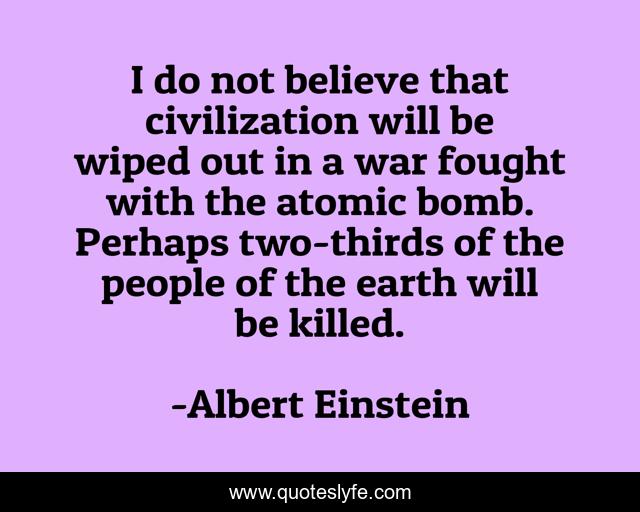 This page presents the quote "I do not believe that civilization will be wiped out in a war fought with the atomic bomb. Perhaps two-thirds of the people of the earth will be killed.". Author of this quote is Albert Einstein. This quote is about future, believe, people,.