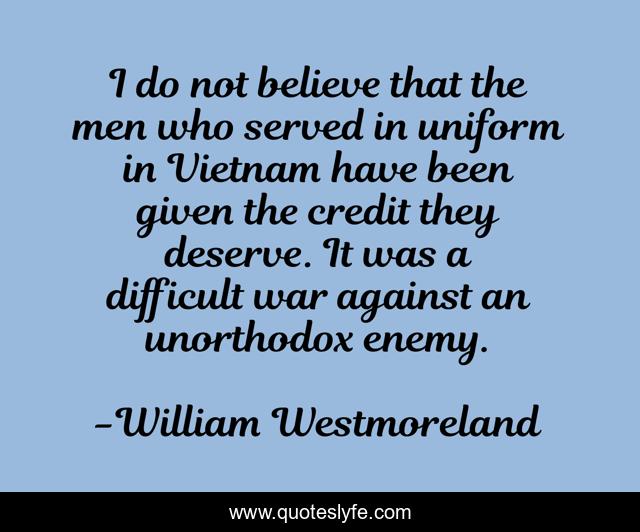 This page presents the quote "I do not believe that the men who served in uniform in Vietnam have been given the credit they deserve. It was a difficult war against an unorthodox enemy.". Author of this quote is William Westmoreland. This quote is about believe, men, uniform,.