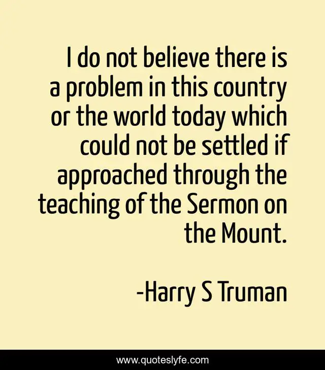 This page presents the quote "I do not believe there is a problem in this country or the world today which could not be settled if approached through the teaching of the Sermon on the Mount.". Author of this quote is Harry S Truman. This quote is about world, believe, today,.