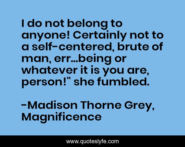 This page presents the quote "I do not belong to anyone! Certainly not to a self-centered, brute of man, err...being or whatever it is you are, person!" she fumbled.". Author of this quote is Madison Thorne Grey, Magnificence. This quote is about alpha-male, madison-thorne-grey, paranormal-romance, alpha-males, romance-novels,.