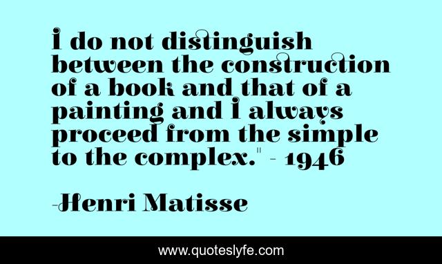 This page presents the quote "I do not distinguish between the construction of a book and that of a painting and I always proceed from the simple to the complex." - 1946". Author of this quote is Henri Matisse. This quote is about writing-process, paintings,.