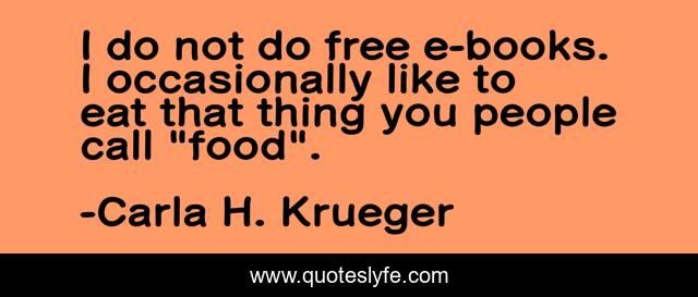 This page presents the quote "I do not do free e-books. I occasionally like to eat that thing you people call "food".". Author of this quote is Carla H. Krueger. This quote is about selling-books, funny, author-carla-h-krueger, humor, humour, humorous, hungry, will-write-for-food, comedy,.
