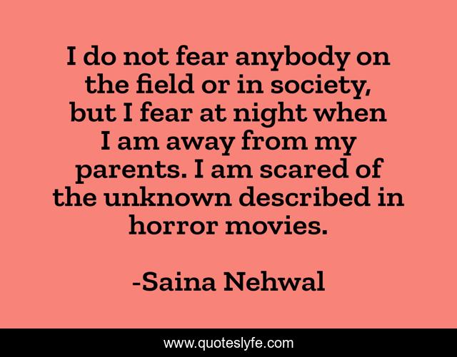 This page presents the quote "I do not fear anybody on the field or in society, but I fear at night when I am away from my parents. I am scared of the unknown described in horror movies.". Author of this quote is Saina Nehwal. This quote is about fear, parents,.