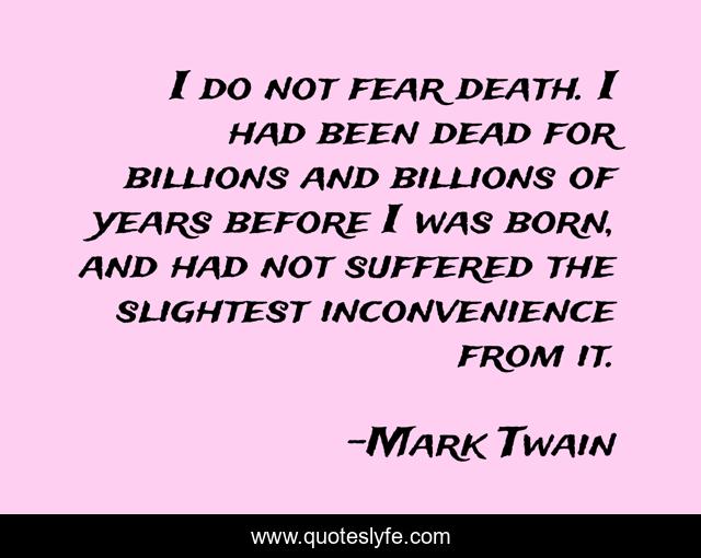 This page presents the quote "I do not fear death. I had been dead for billions and billions of years before I was born, and had not suffered the slightest inconvenience from it.". Author of this quote is Mark Twain. This quote is about enthusiasm, death, inspirational,.