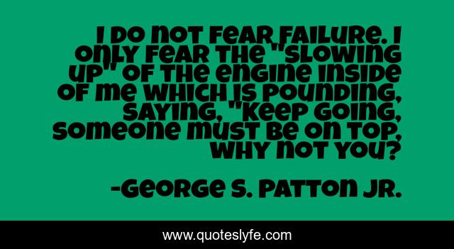 This page presents the quote "I do not fear failure. I only fear the "slowing up" of the engine inside of me which is pounding, saying, "Keep going, someone must be on top, why not you?". Author of this quote is George S. Patton Jr.. This quote is about action, failure, ambition,.