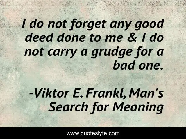 This page presents the quote "I do not forget any good deed done to me & I do not carry a grudge for a bad one.". Author of this quote is Viktor E. Frankl, Man's Search for Meaning. This quote is about grudge, good, viktor, life, frankl, meaning,.