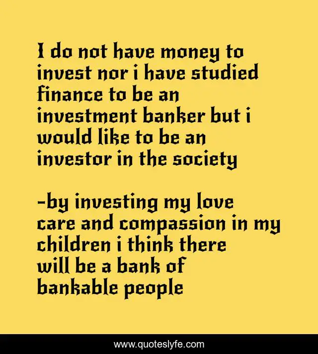 This page presents the quote "I do not have money to invest nor i have studied finance to be an investment banker but i would like to be an investor in the society". Author of this quote is by investing my love care and compassion in my children i think there will be a bank of bankable people. .
