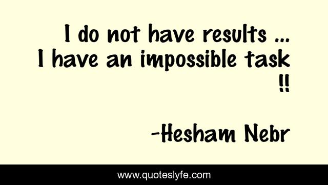 This page presents the quote "I do not have results ... I have an impossible task !!". Author of this quote is Hesham Nebr. This quote is about hopeful, inspiration,.